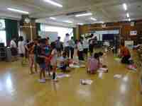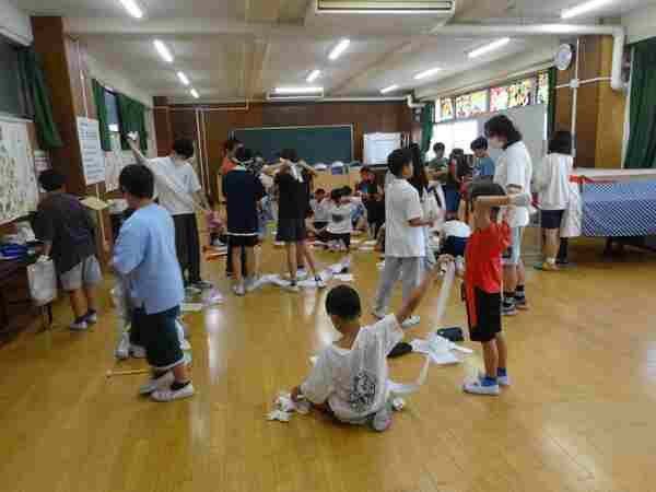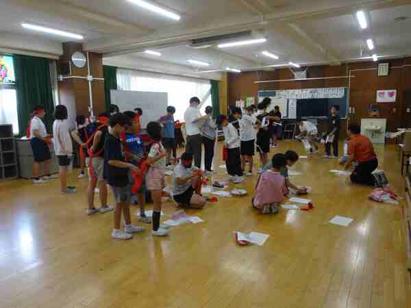 10月2日、業間休みにプレイルームをのぞくと、応援団が練習をしていました。今日はハチマキ、タスキを配られたようで、実際に、友達に手伝ってもらいながらタスキを付けていました。学年の掲示板に運動会の取組が掲示してあり、10月に入って運動会に向けての気持ちが高まりつつあります。