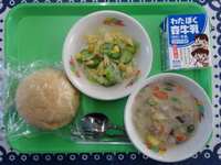 また、今日は読み聞かせのお話にちなんだ献立で「メロンパン」が出ました。いつもとは違うパンで「美味しい!」「メロンパン、好き」と感想を言ってくれる子もいました。