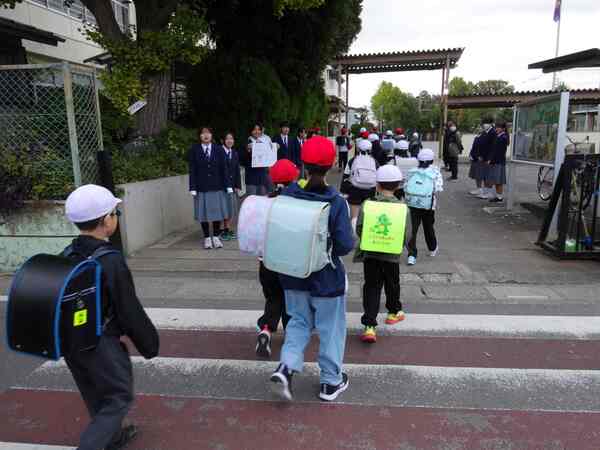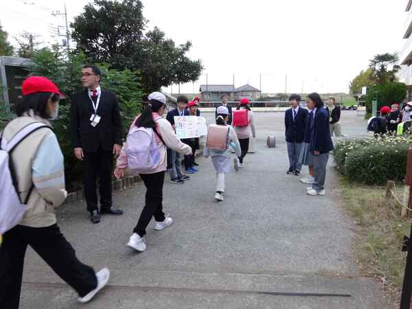 11月6日、曇り空でちょっと寒さを感じる朝でした。今日は土屋中の生徒会等のみなさんが馬宮東小にあいさつ運動をしに来てくれました。いつも最初は遠慮がちな雰囲気で始まりますが、今日は多くの土屋中生、しかも卒業生が来てくれました。制服姿や成長した姿を見ると頼もしく感じます。