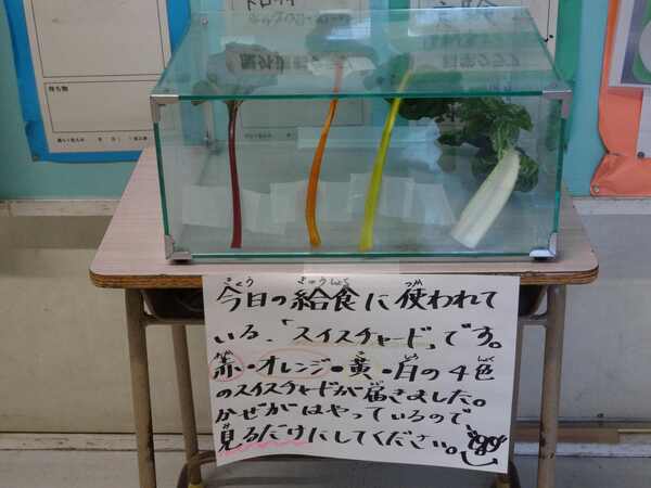今日のカレーは「こえどカレー」。サツマイモの甘さとちょっぴりスパイシーさでご飯も進みました。「スイスチャードのツナマヨサラダ」は、聞くことが少ない野菜の名前ですね。いろどりもよく美味しく食べられたのではないかと思っています。