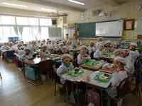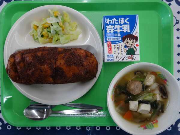 12月11日、今日の献立は、ココアあげぱん、にくだんごスープ、コーンサラダ、牛乳です。ココア味のあげぱんは多くの子どもたちが好きな味です。どのクラスも口の周りにココアの粉をつける子もいるなど、楽しく、にぎやかな給食時間を過ごしていました。