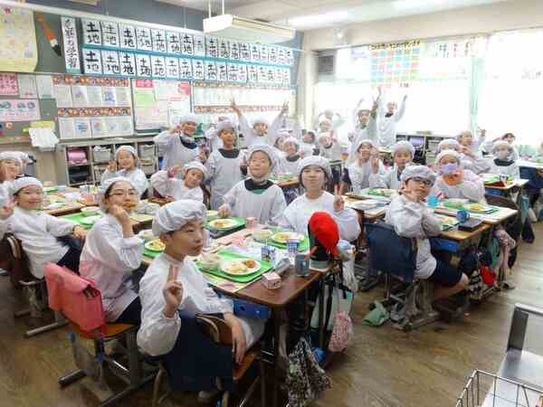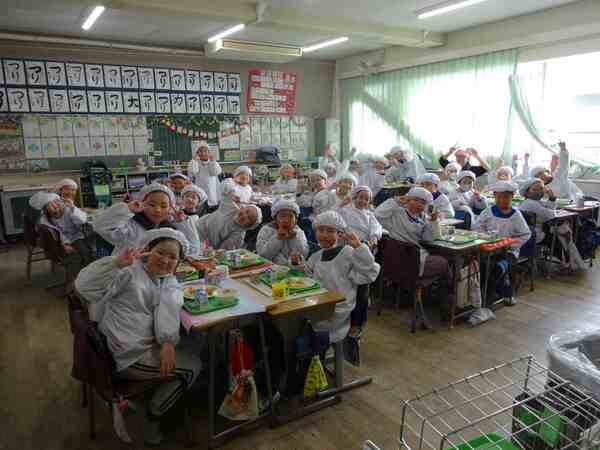教室に行くと、2学期最後の給食、そして、クリスマス献立ということで、「美味しい!」という声や多くの笑顔を見ることができました。