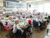 12月19日、今日は2学期の給食最終日です。「ピラフ、フライドチキン、マカロニスープ、クリスマスケーキ」のクリスマス献立。楽しみにしている子も多く、給食準備中、1年生で見本の盛り付けの場所が、いつも以上に賑やかでした。