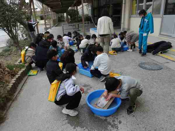 1月20日、今日は風が強く、また寒い一日でした。5時間目、3年生が、ぞうきんをきれいにしていました。使っているのは、洗濯板、たらい、石けんです。どうやって使うといいのかを試したり、友達と相談したりしながらやっていくうちに、ぞうきんの汚れがとれて、子どもたちからも「きれいになっている!」という声があがりました。水の冷たい中でしたが、よく頑張っていました。