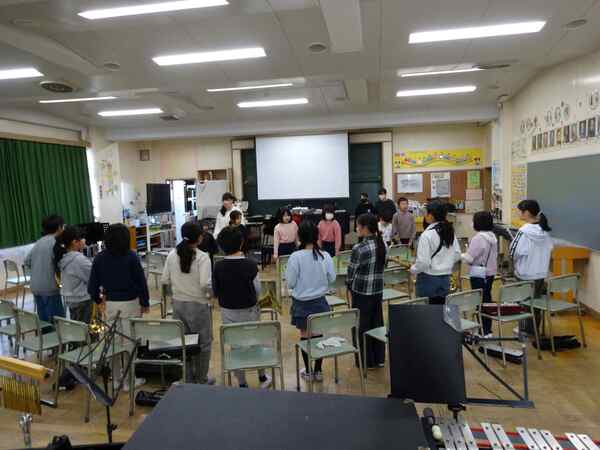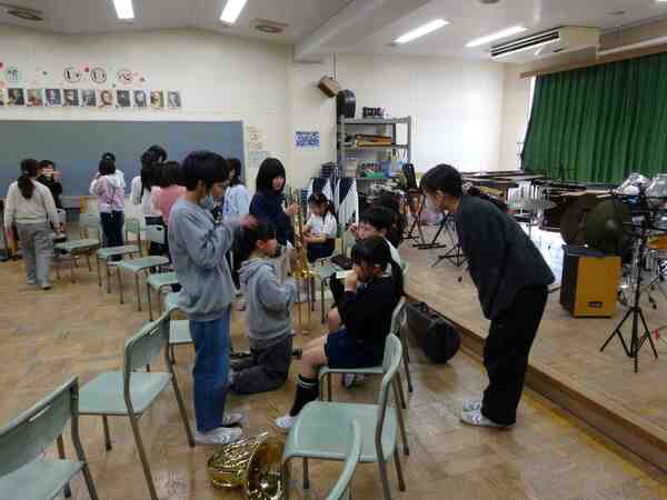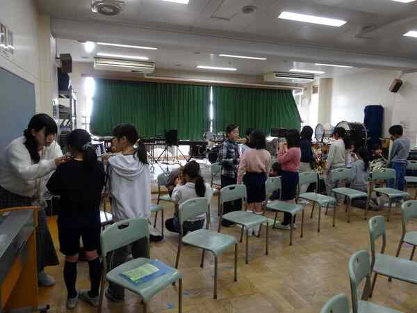 2月5日、業間休みに音楽室へ行くと、3年1組の希望する子たちが、吹奏楽部の楽器の体験をしていました。6・4年生の吹奏楽部員さんたちが、吹き方を丁寧に教えてたり、音が出ると褒めたりしてくれました。3年生の子たちも音が出る嬉しさや褒めてもらった楽しさを味わえる機会となりました。