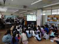 2月17日昼休みに、図書委員さんが読み聞かせをしてくれました。3学期2回目です。今日は「ぎょうれつのできるケーキやさん」という本です。挿絵をスクーリンに映し、ゆっくりと読み聞かせをしてくれたので、分かりやすかったです。読み聞かせを聞きに来た子には「しおり」のプレゼントもありました。