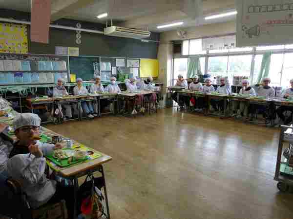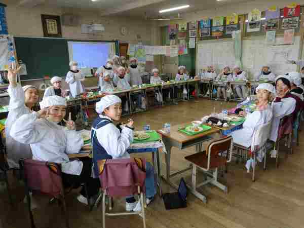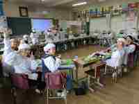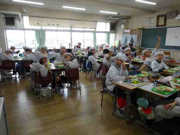 3月19日、今日が今年度最後の給食でした。「卒業・進級お祝い献立」です。「あおなとハムのピラフ、牛乳、ABCスープ、さつまいもタルト」でした。各教室に行くと、いつもと変りなく班で楽しく食べていたり、クラスみんなが1つの円になって食べていたりしていました。6年生にとっては小学校生活最後の給食でした。今日もいつもと同じで、美味しかったですね。